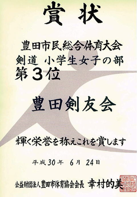 豊田市民総合体育大会 小学生女子の部で3位に入賞!